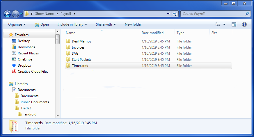 Next is the time cards folder. I store time cards by weekending. So my files, will say times heets, an acronym for the show I’m working on (three or four digits) the weekending; year first, month second, date third (always Saturday weekending). For example, 2018-03-10, would be weekending March 10th, 2018. At the end of it, it will specify whether it’s version one, version two, or version three. If it’s DGA, IA, teamster, or non-union, I segment them in terms of how I want my invoices to come out of payroll and how I want to get edits.