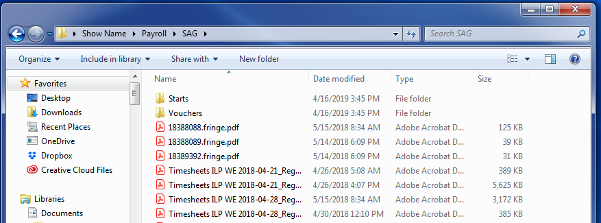 I also keep two separate folders in the SAG folder. The first is the folder for SAG Starts and the seconds is for Vouchers. The time sheets that I create from the Exhibit Gs are in the SAG folder and I use the starts folder to store the SAG files as described. The voucher folder is where I keep all the extras vouchers. Although they’re not all SAG, I still keep the vouchers in one place and put, in the file name, whether it’s union or non-union.
