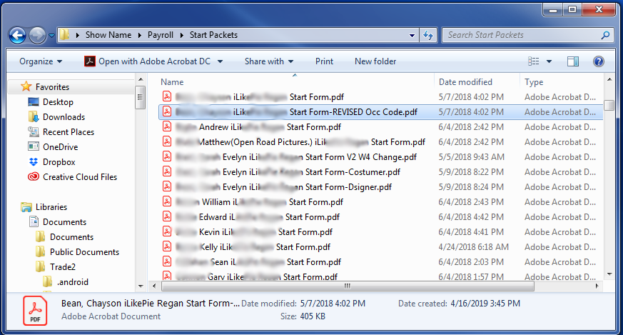 In this section I will go over how I use the computer’s built in file manager and Adobe PDF Writer to sort and build the start packets and time cards I receive each week. The file manager in every computer and every type of system (PC, Mac, Linux) is designed to sort and alphabetize faster and more efficiently that a human will ever be able to.