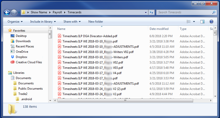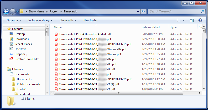 I name the combined file a Time sheet and give it a three-digit or a three-letter identifier or acronym. If the show has a five-letter name or a five-word name, I give it an acronym or whatever winds up percolating up as far as the naming, I give it a weekending (WE), and then I give it a four-digit year, two-digit month, two-digit weekending, and then I give it the name with distinguishing characteristics of what it is I’m doing. So if I’m doing writers, for example, I name it writers. For example: Timesheets CoN WE 2018-03-17_Show Name.pdf