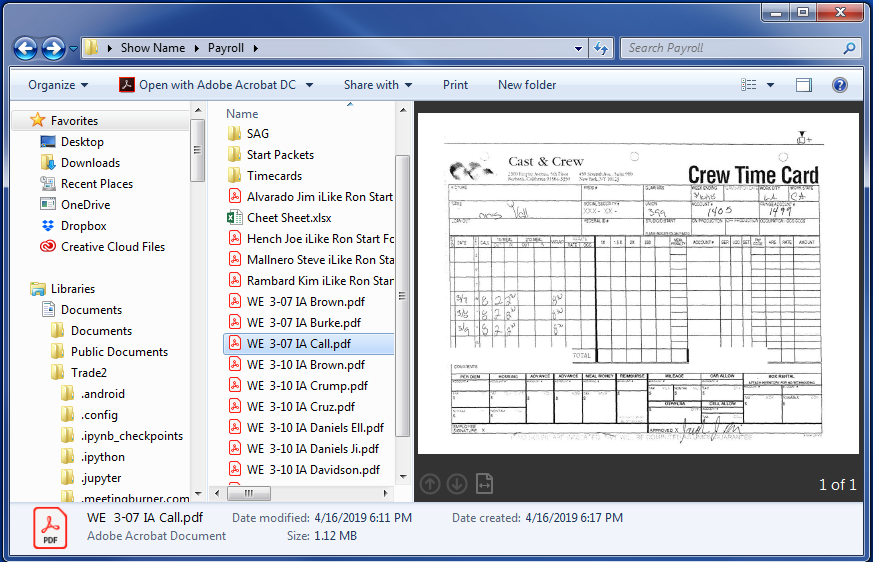 I’m simply going to input a few characters and let the machine do all the work as far as the sorting and the alphabetizing of those documents. Once they’re in alphabetical order by crew name, I then take all the time cards in a given type (IA, TM, etc) and weekending and combine them back into a single PDF file by weekending and union type.