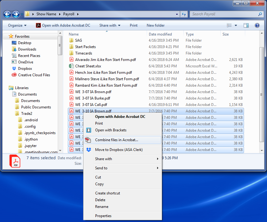 To combine the files, I simply highlight all the files, right click, then select “combine” in Adobe or whatever PDF software I am using and it’ll combine all of those files in alphabetical order. Now I don’t have to move stuff around. The machine has done all the work. All I have to do is check the file to see if things are the way I need them to be within the file. If the combining is correct, I save the combined file and delete the individual files that were used to combine.