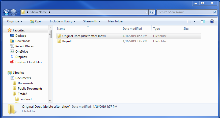 The first thing I do when I receive these documents and put them in the payroll folder is copy the file into the “Original Docs” folder. I store them in another folder outside of the payroll folder I name “Original Doc (delete after show)”.